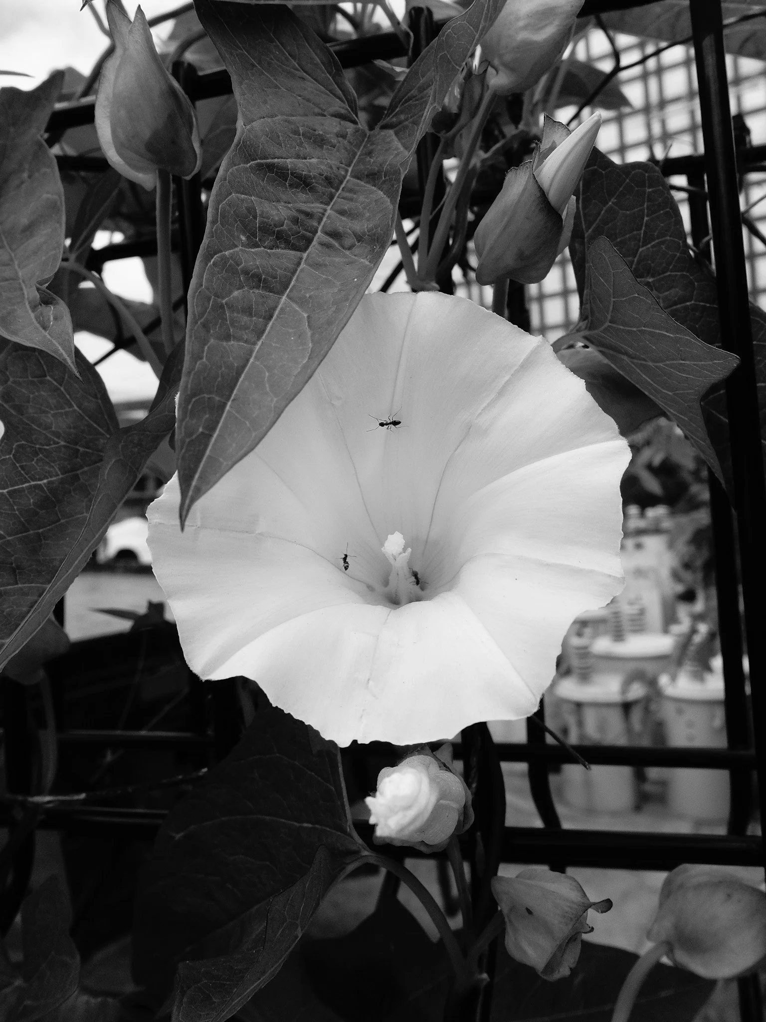 I parked at my usual spot and on a nearby fence there were some flowers blooming. Upon closer look, I see ants hanging out inside of them.