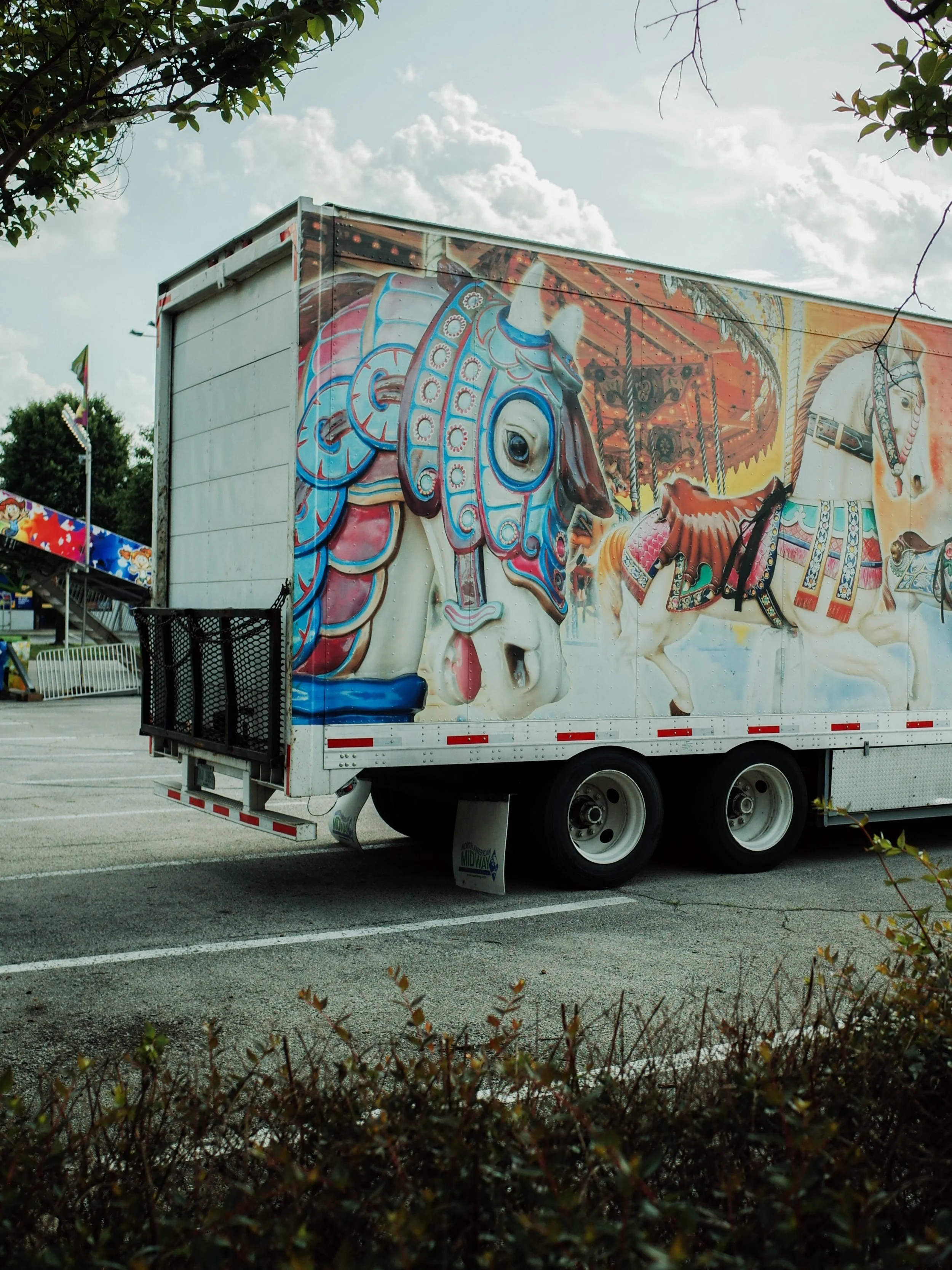 This carousel trailer grabbed my attention as I finally started leaving the fair grounds. The bright colorful graphics were a nice contrast to the grey clouds rolling in.