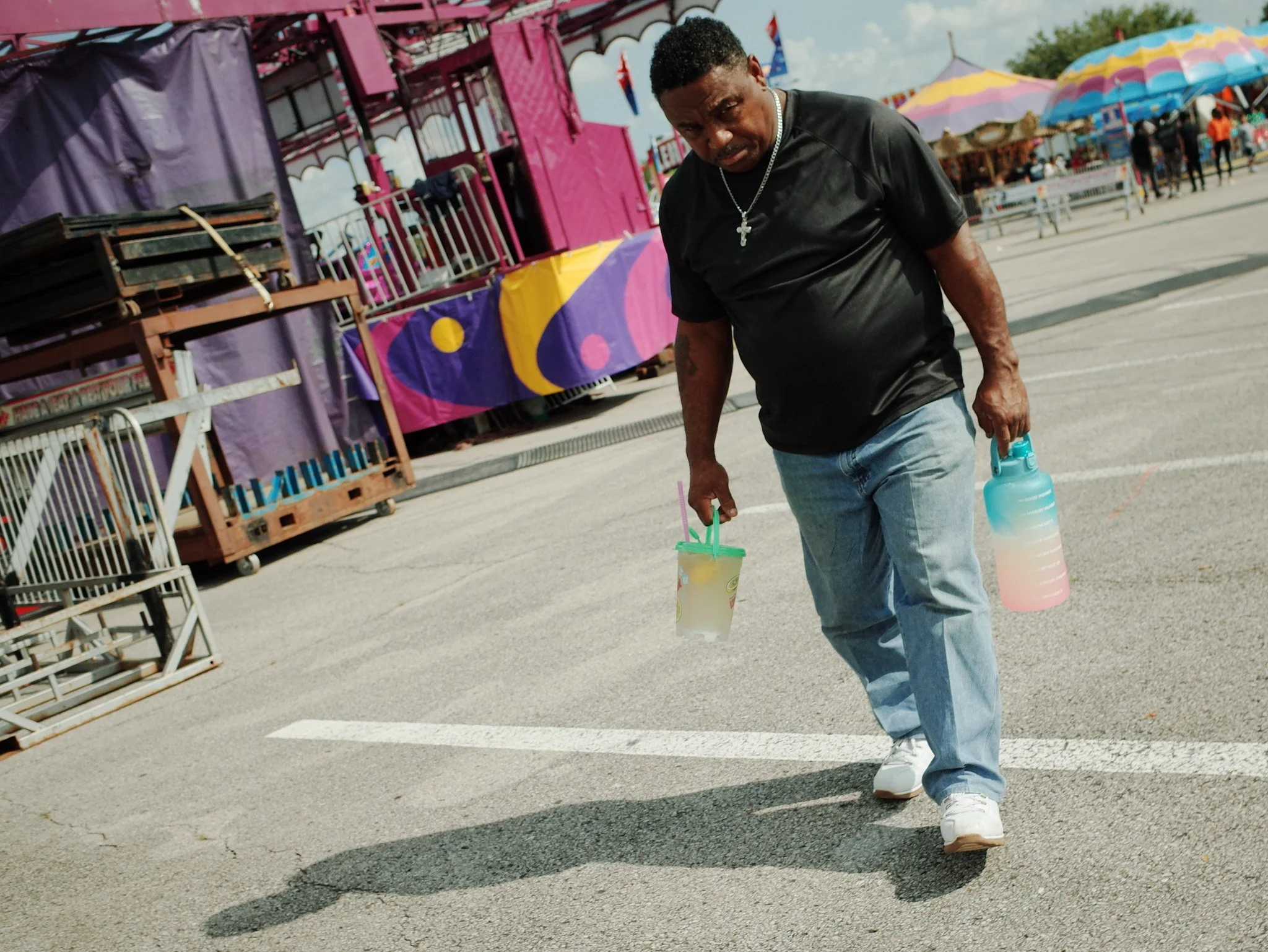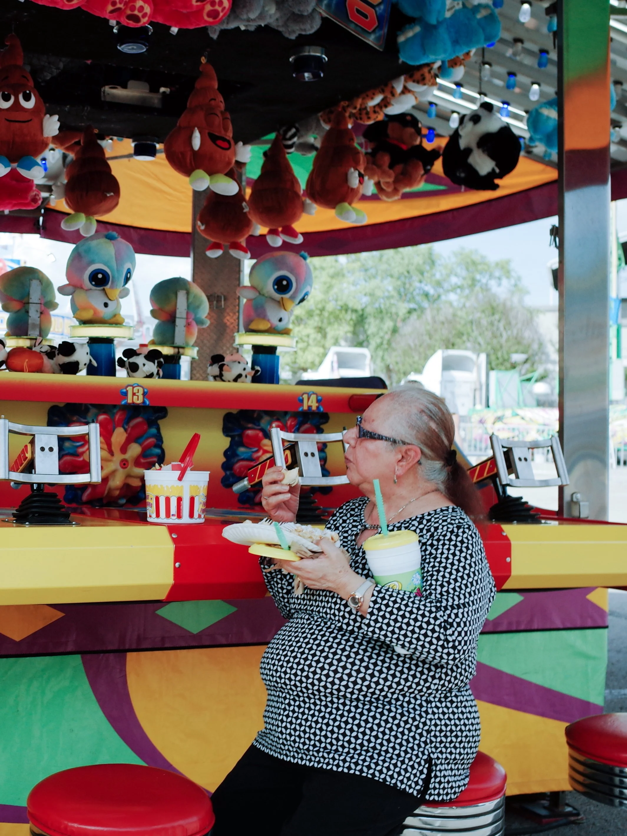 I continued through the gaming area and noticed this lady indulging in the park’s concessions. Funnel cake in her hand and a large, icy lemonade under her arm as she watched her daughter try to win a prize.